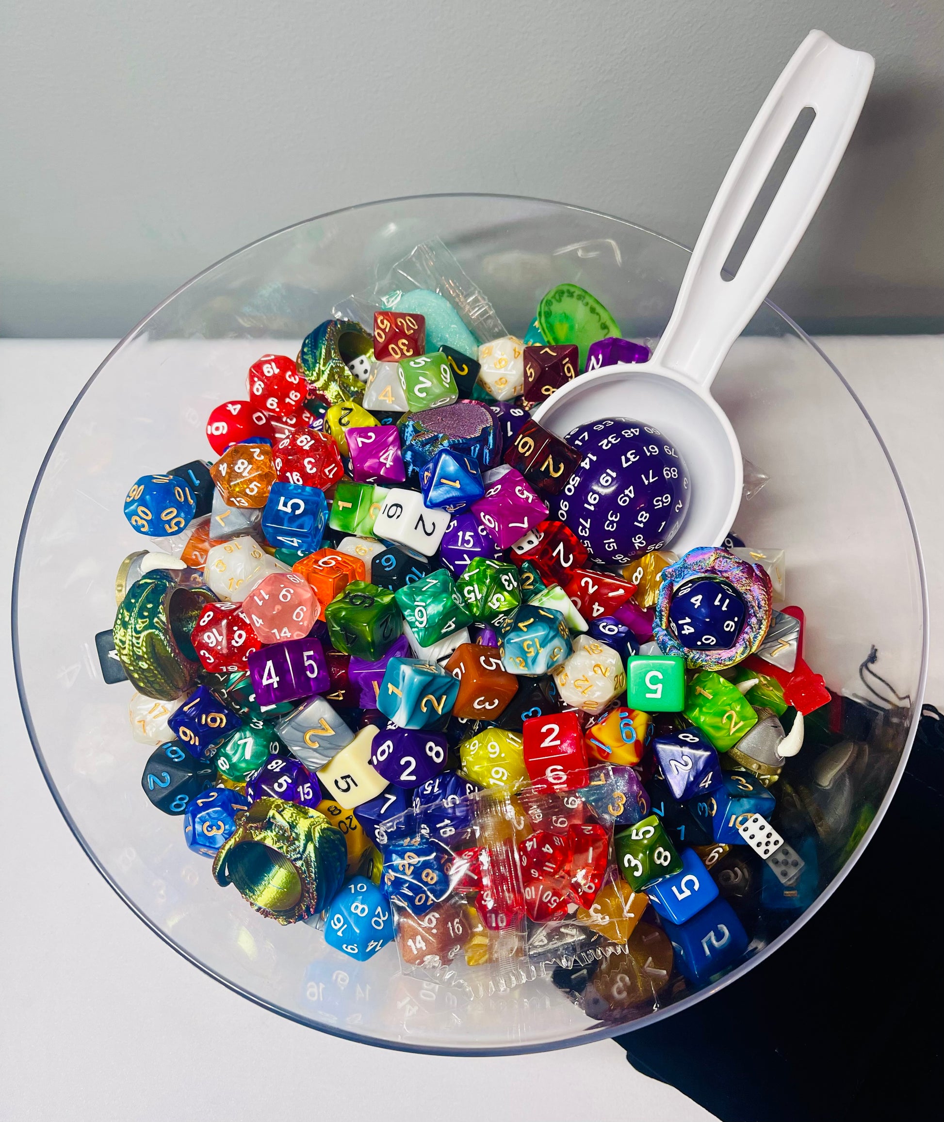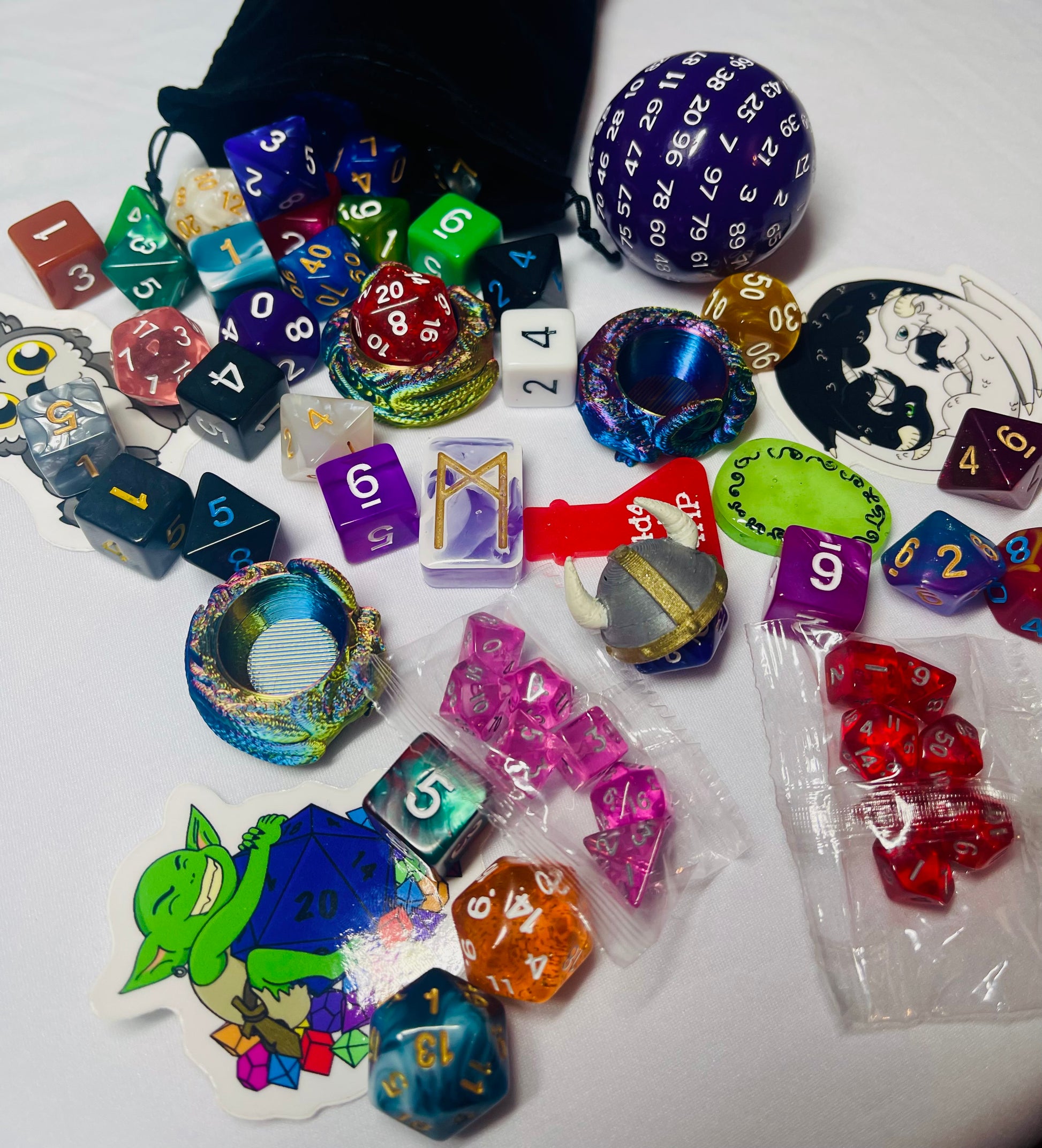 With our dice scoop you get a full bag filled with around 35 or more dice, the chance of getting some of our awesome extras and one of our custom stickers!